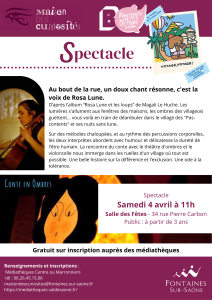D’après l’album “Rosa Lune et les loups” de Magali Le Huche. Les lumières s’allument aux fenêtres des maisons, les ombres des villageois guettent… vous voilà en train de déambuler dans le village des « Pas-contents » et ses nuits sans lune. Au bout de la rue, un doux chant résonne, c’est la voix de Rosa Lune… Le samedi 4 avril, à 11h, à la salle des fêtes.